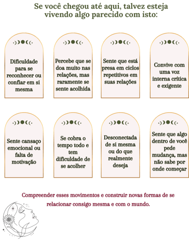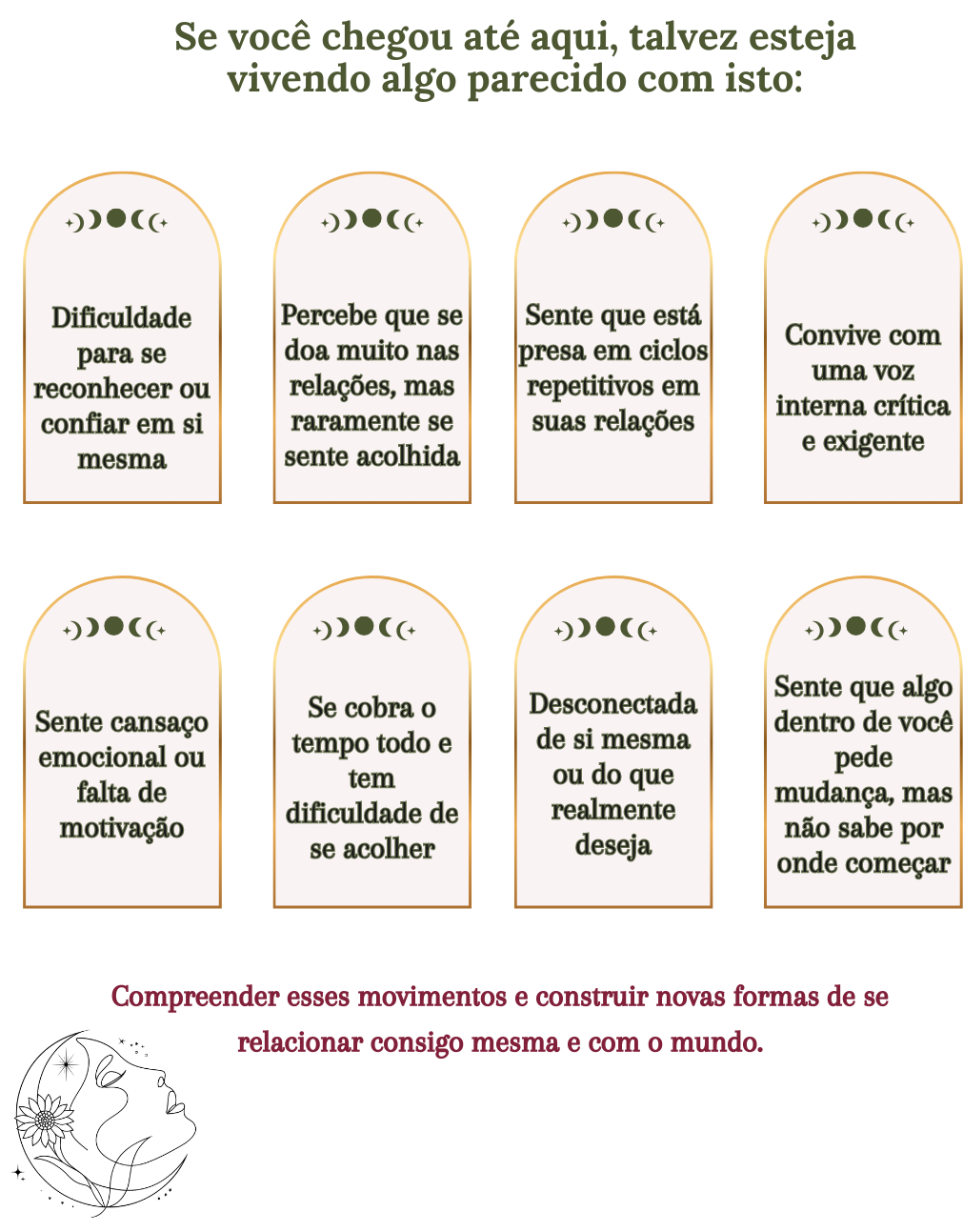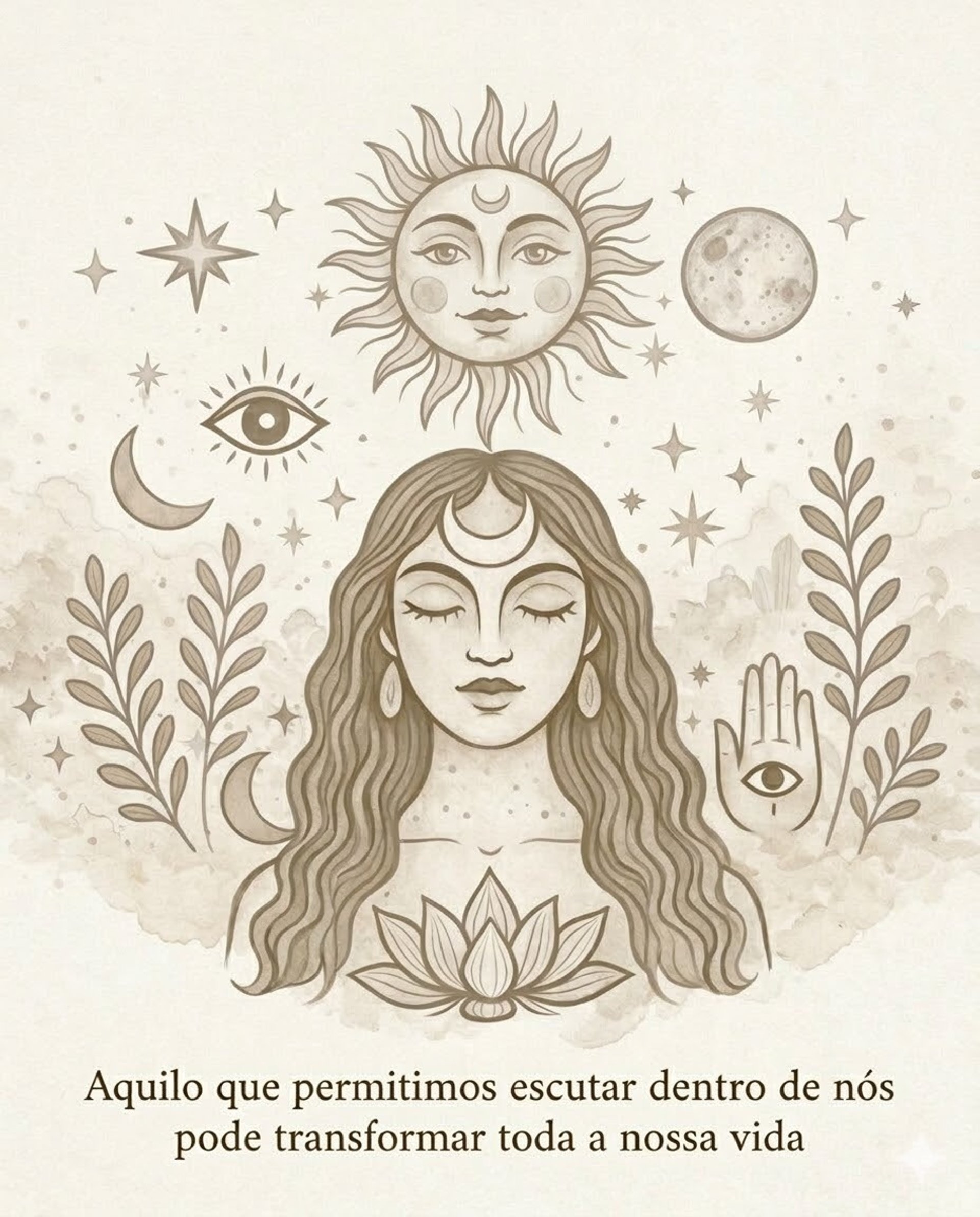 Ela te convida a olhar para dentro, para suas emoções, sonhos, padrões e histórias que muitas vezes atuam no silêncio do dia a dia.