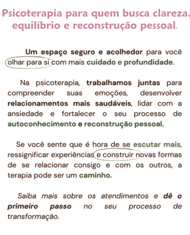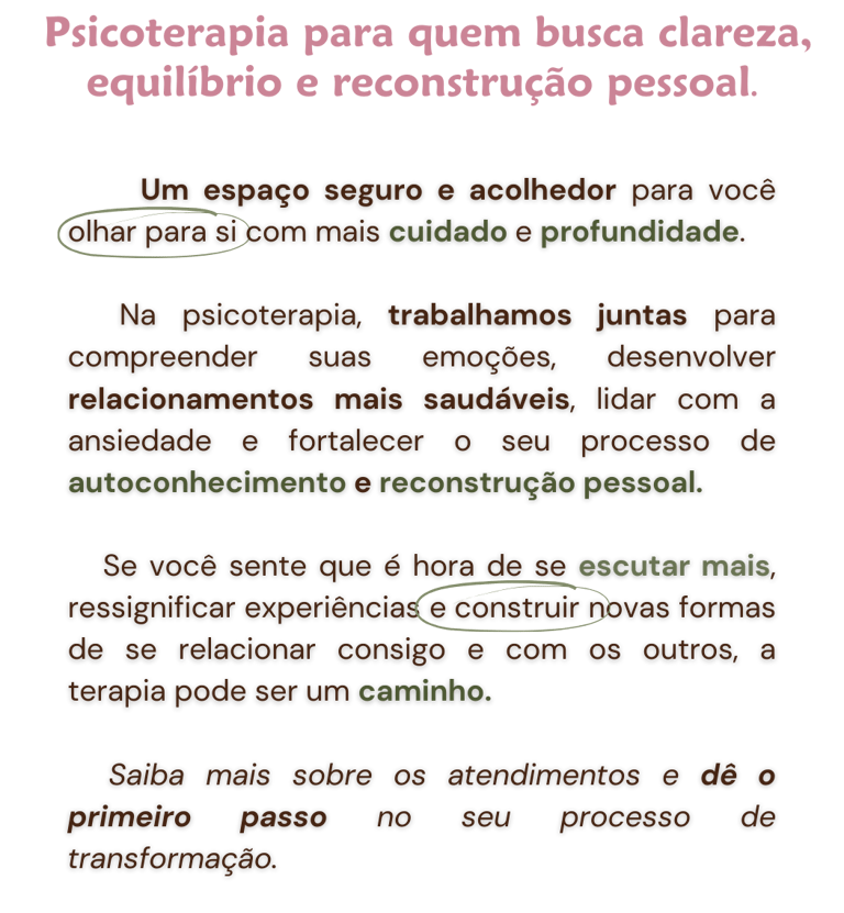 Juntas, vamos olhar com carinho para suas emoções, comportamentos e padrões de pensamento, buscando caminhos mais conscientes, estratégias que façam sentido para você e formas mais saudáveis de se relacionar consigo mesma e com os outros.